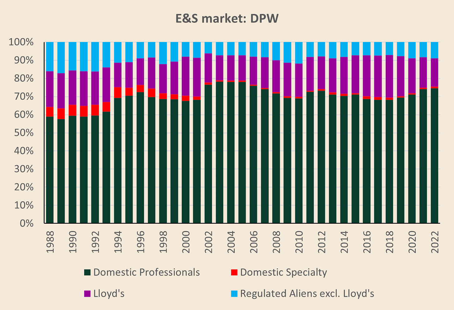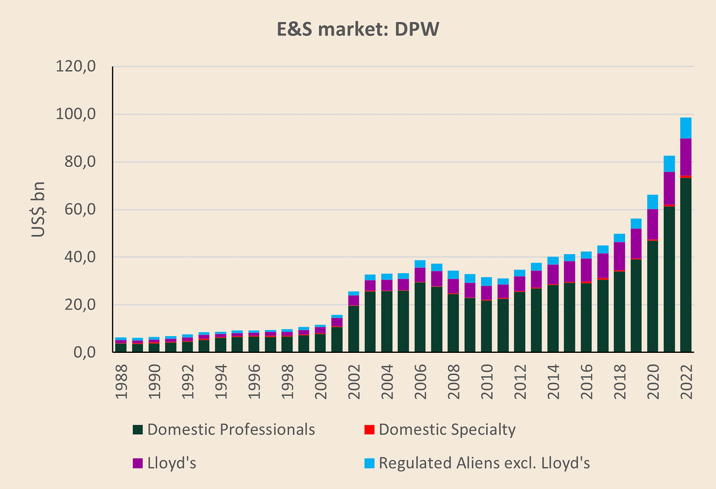 Historically, domestic professional and specialty companies together dominated the U.S. E&S market. Over time, their combined market share has eroded somewhat, while Lloyd’s and certain regulated alien insurers have maintained or modestly expanded their presence. The overall surplus lines market, however, has grown significantly since the late 1980s. Charts of direct premium written (DPW) by segment show that all four groups have increased their absolute premium volumes, even if their relative shares have shifted over time.