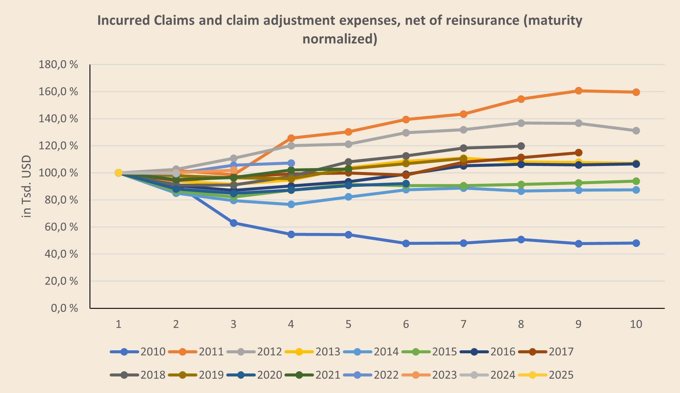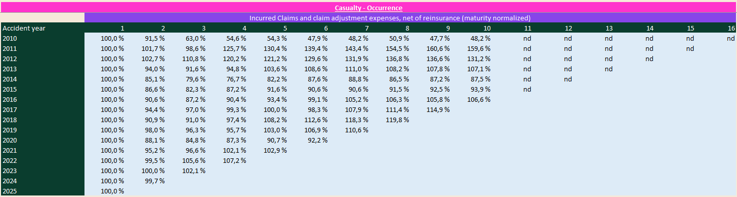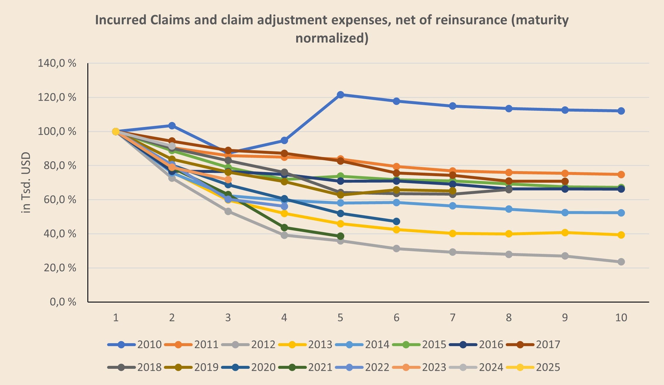 If a curve sits above 100%, the initial estimate was too low and multi‑year development is adverse (while single year PYD’s can still be negative and vice verca!). If it sits below 100%, the initial estimate was conservative and development is favorable.