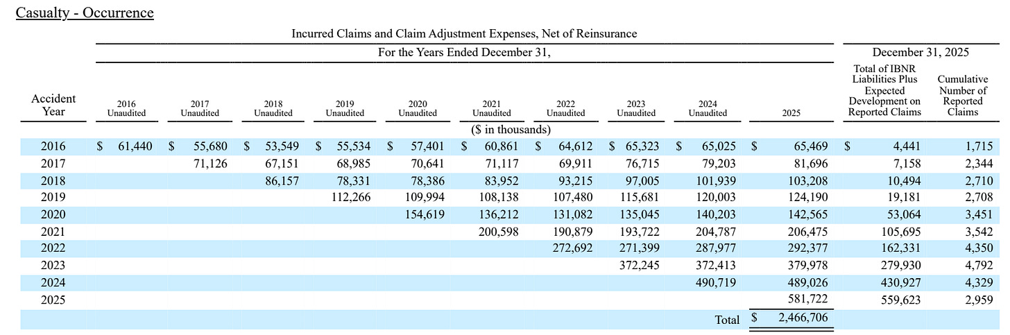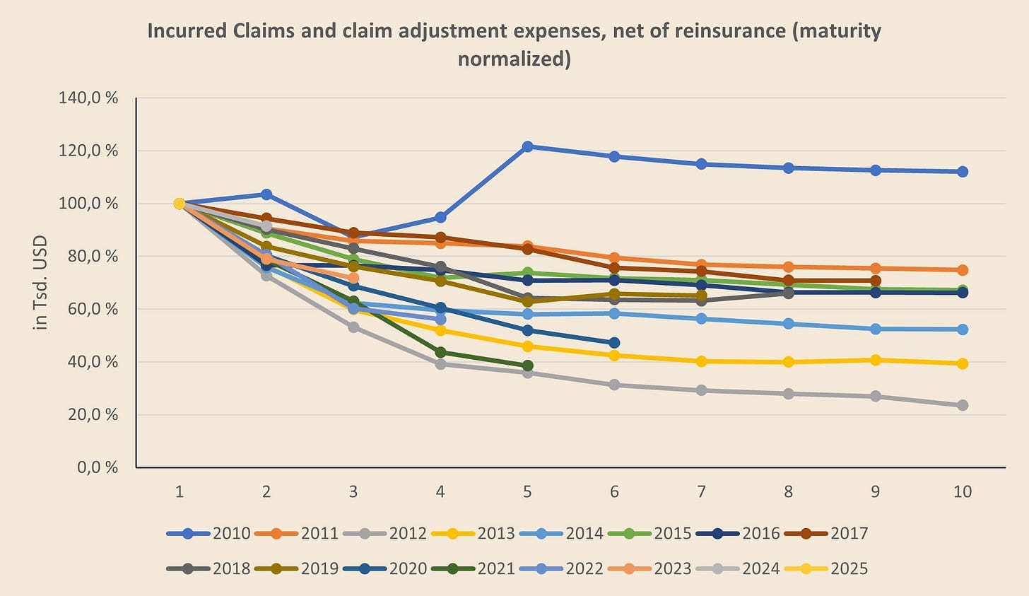 In Part 4 of my Kinsale Deep Dive I explained the mechanics of loss development triangles in more detail. Most investors probably never go deep here — which is a pity, because it’s one of the few places where you can move from “story” to “evidence.” Rather than repeating the full explanation, I’ll point you to Chapter 5 in Part 4 (“Reserving quality: what the loss triangles tell us”).