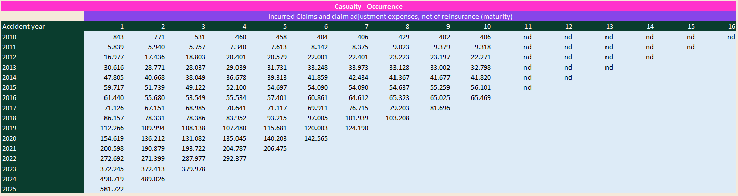 The incurred claims triangle (shown above as an example) reflects economic losses (including loss adjustment expenses). It’s a best estimate of ultimate cost. That’s why the incurred triangle is the most direct window into reserving: it shows how the insurer re‑estimates ultimate losses for a cohort as new claims are reported, cases settle, court outcomes come in, and inflation and cost trends evolve.