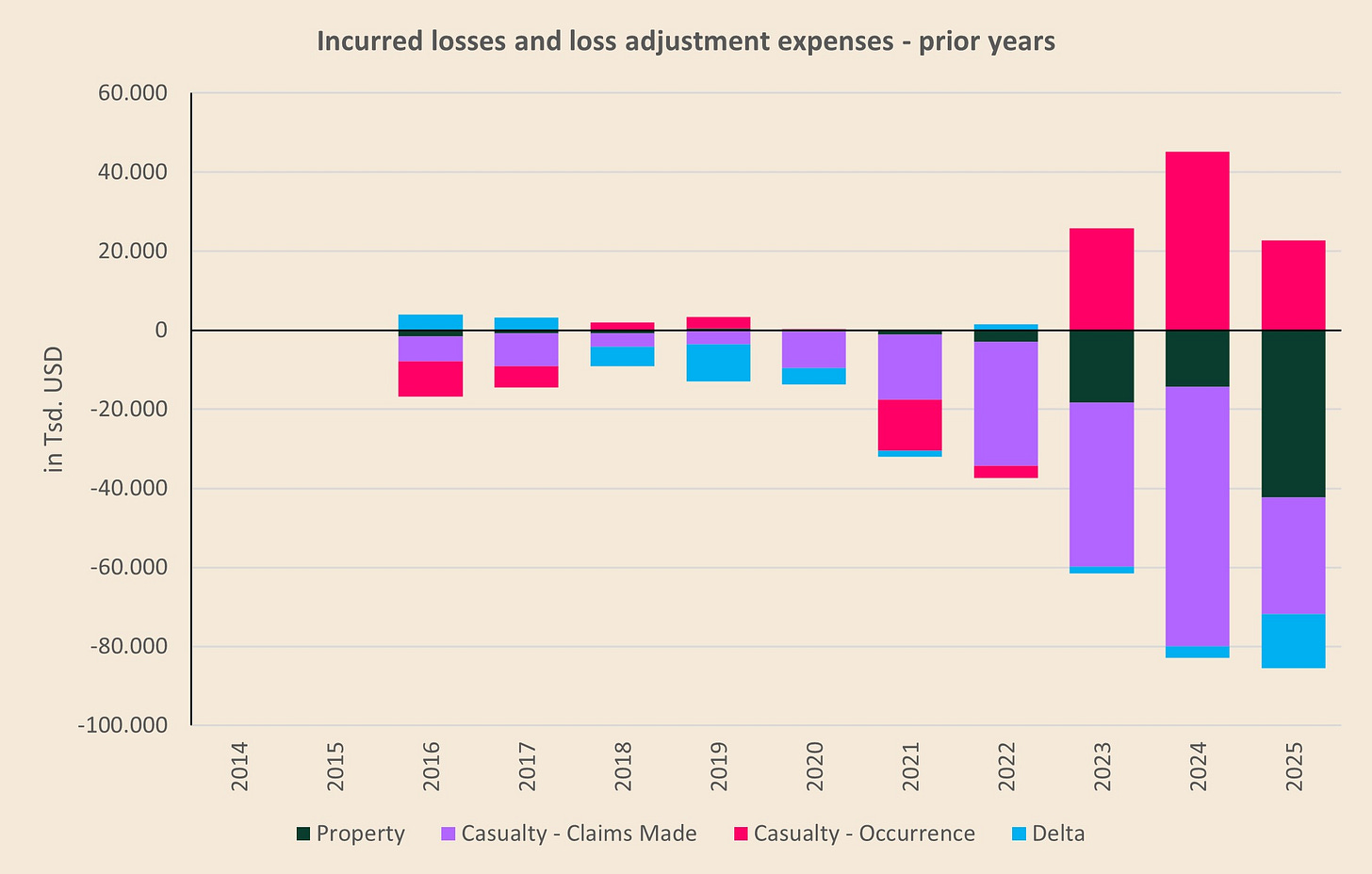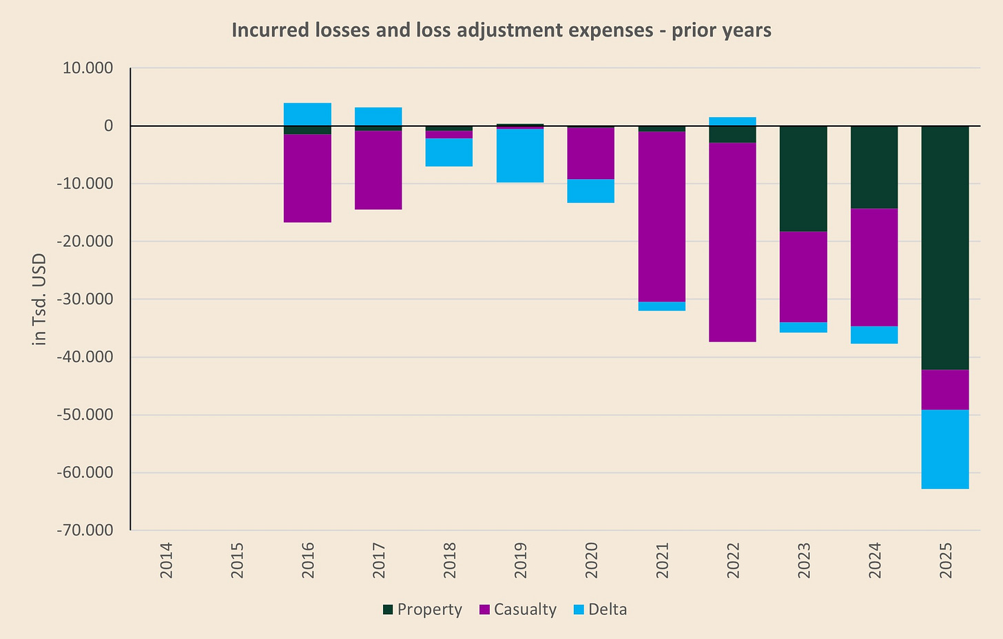 The blue “delta” bars are simply the residual caused by limited disclosure (for example, property triangles are only disclosed for a limited number of 5 years, so you can’t compute the full history). In other words, the delta is the net PYD that sits outside what we can attribute cleanly to the three disclosed buckets.