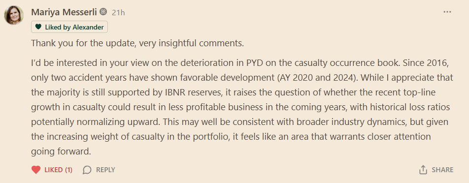 I want to use her question to write a short standalone post on prior‑year development (PYD) and what the loss triangles are really telling us.