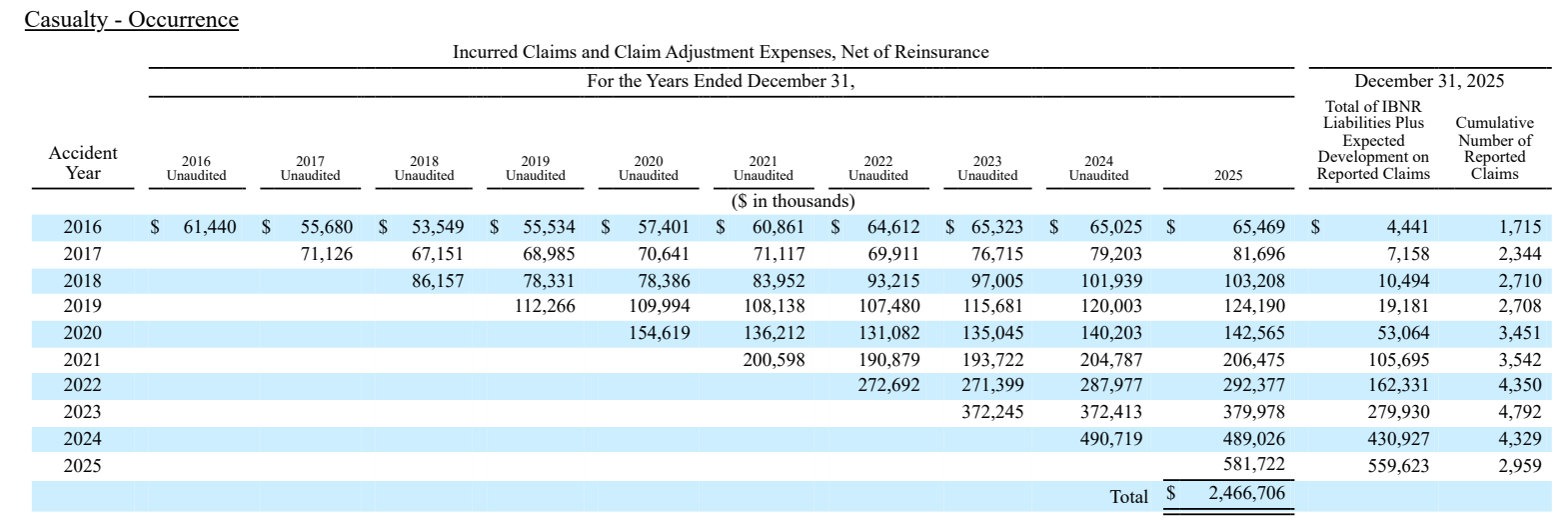 We start with the loss triangle (taken from Kinsale’s 10-K and extended with earlier years where possible). You can also see the disclosure limitation here: only ten years are shown, so everything beyond year 10 is effectively a black box.