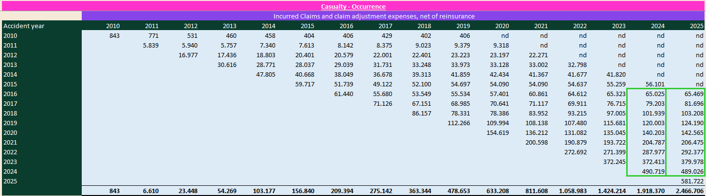 My take: the triangles do tell us that several occurrence cohorts developed worse than the initial picks. But I would be careful jumping from that to “the business was underpriced.” Occurrence casualty is long‑tailed and heavily influenced by severity trends, social inflation, litigation dynamics, and mix shifts. Any of those can push ultimates higher even if pricing discipline was solid at the time.